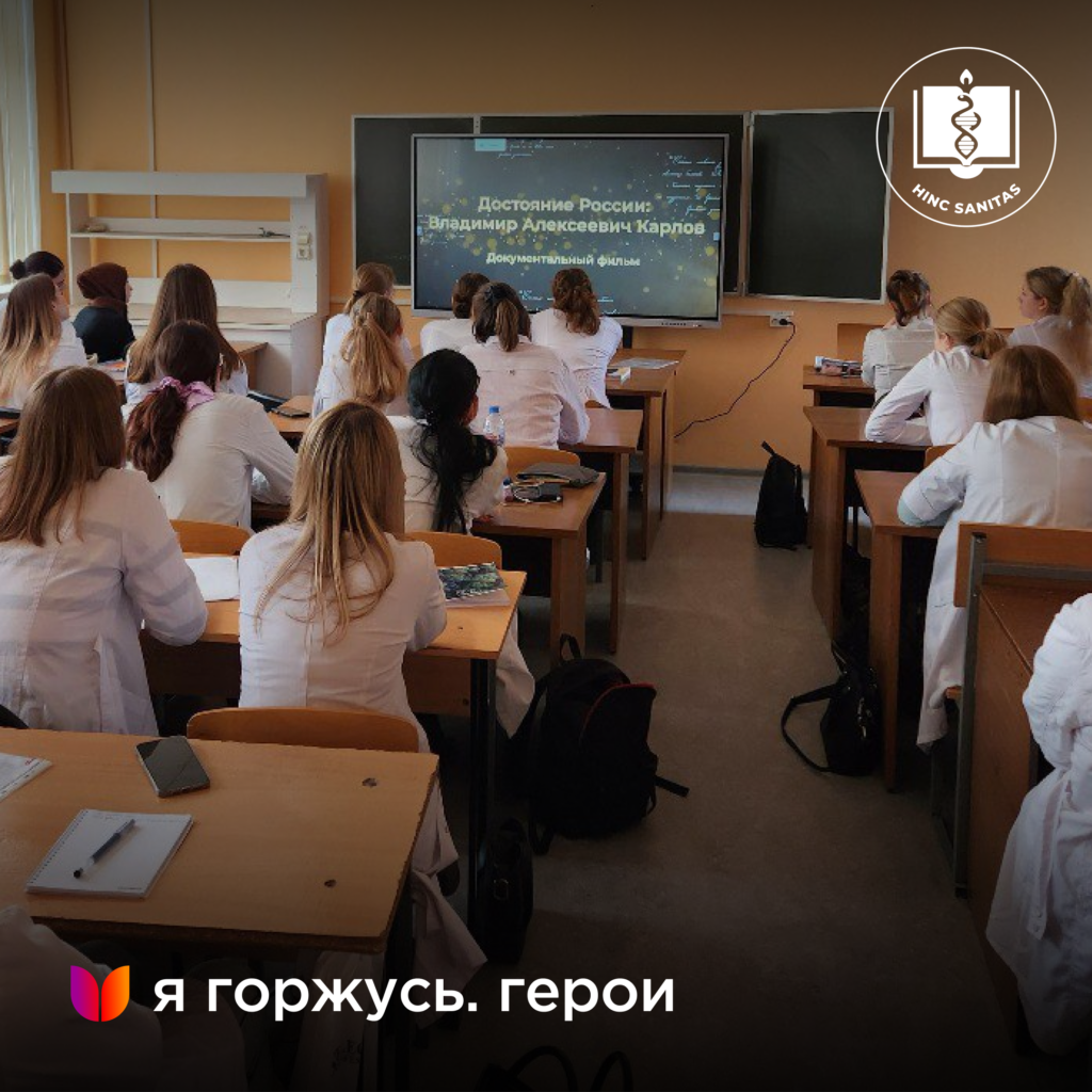 В рамках реализации Всероссийского проекта «Я горжусь. Герои» 10 ноября 2023 года на одной из учебных баз нашего Университета состоялся просмотр и обсуждение интервью с ветераном Великой Отечественной войны, советским и российским неврологом, доктором медицинских наук, член-корреспондентом РАН, Заслуженным деятелем науки РФ, профессором кафедры нервных болезней МГМСУ им. А.И. Евдокимова — Владимиром Алексеевичем Карловым.